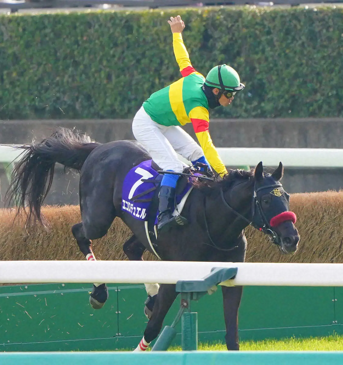 「冠名+決闘」という馬名意味のエコロデュエル。その名の通りにレース後半、2周目の向こう正面からジューンベロシティ(2018.4.10)との一騎打ちとばかりに進出。ジューンベロシティ騎乗の森一馬騎手の「そこから行ったら早いっすよ」「太郎さん、早いっすよ」の2度の声掛けをスルーして勝ちに行ったエコロデュエルと草野太郎騎手。最近はレース中に時速が表示されますから、平地で60km/h近いスピードを出して駆けたエコロデュエルのペースは確かに速く見えました。残り800mで単騎となったエコロデュエル、600mを切って「頑張れ!!辛いよな、頑張れ!!」と草野騎手の掛け声。最後の直線に入って10号障害のハードルを跳んだ時に「危ない!!」となりましたが、草野騎手が鬼の体幹で乗り切ると後はエコロデュエルと草野騎手の世界となり、フィニッシュ前の70mで「頼むっ!!頼むっ!!」。そうして決勝点では2着のネビーイーム(2018.2.19)に8馬身差、終わってみれば中山芝4260mのコースレコード4分50秒5の完勝。エコロデュエル、草野騎手、岩戸孝樹調教師、原村正紀オーナー。皆がJ・GI初勝利となった2025年の中山グランドジャンプでした。