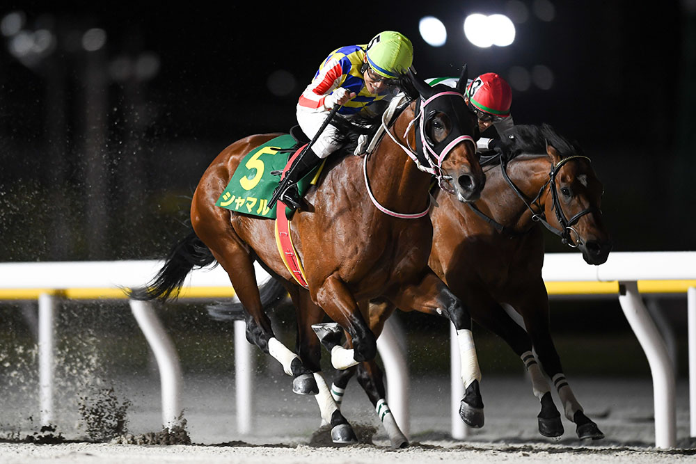 かしわ記念で連覇を果たしたのはエスポワールシチー(2005.4.22)、コパノリッキー(2010.3.24)、ゴールドドリーム(2013.4.19)に続いてシャマルが4頭目。昨年2024年は得意の不良馬場での逃亡劇でしたが、今年2025年は良馬場で逃げたウィリアムバローズ(2018.2.17)の番手先行策。入りの600m37秒7、1000m通過1分2秒3という昨年よりも緩い流れ。船橋競馬場の3角から4角、スパイラルカーブで先行2騎が刻んだ1ハロンのラップはレース最速の11秒7であり「コーナーワークで引き離す」という前に行った馬の勝負に持ち込みました。そうして迎えた最後の直線308m。少し離れた位置からコスタノヴァ(2020.4.3)、ロードフォンス(2020.4.27)が差し込みを見せる中、内で粘るウィリアムバローズ、外から必死に追うシャマル。最後の最後、4頭が「2分の1馬身」「アタマ」「2分の1馬身」というコンマ2秒差の攻防の中で抜け出したのがシャマル。右腕を高々と振り上げた川須栄彦騎手、渾身の騎乗。「相棒」シャマルと共に見事な2年連続勝利でした。